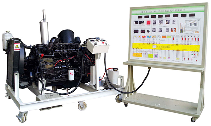 柴油發(fā)動機總成、組合儀表、發(fā)動機控制單元、散熱系統(tǒng)(水箱、風(fēng)扇、上下水管)、排氣系統(tǒng)、進氣系統(tǒng)(進氣軟管、空氣濾清器總成)、原車電路原理圖板及檢測端子面板、蓄電池、電源總開關(guān)、燃油箱、油水分離器、油門踏板裝置、可移動機臺架、臺架高溫及轉(zhuǎn)動等部位加裝防護裝置等。