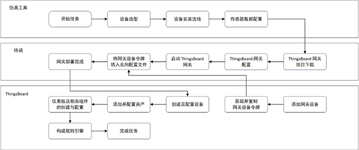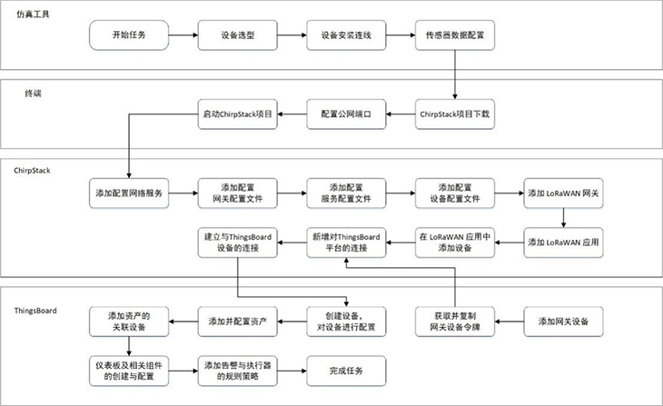 模擬智慧牧場系統(tǒng)還引入使用開源軟件平臺ChirpStack與ThingsBoard,結(jié)合LPWAN技術(shù),實現(xiàn)遠程低功耗數(shù)據(jù)采集、上報和展示。在ChirpStack平臺上,用戶可對網(wǎng)關(guān)、GPS、溫濕度傳感器等設(shè)備進行配置,以上送仿真實驗中的虛擬數(shù)據(jù)。在ThingsBoard平臺上,設(shè)置牧場地圖、告警信息、溫濕度等各儀表盤組件;獲取仿真設(shè)備上送的數(shù)據(jù),并將數(shù)據(jù)以圖表形式作可視化呈現(xiàn);以及基于流式編程添加相應(yīng)的規(guī)則策略,最終完成模擬智慧牧場實訓(xùn)場景的部署搭建。