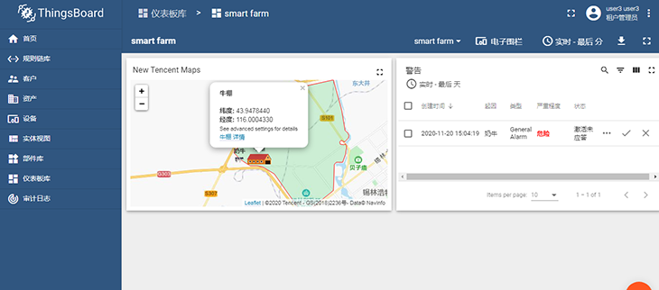 圖:智慧牧場課程案例,使用GPS對奶牛位置進行定位,通過LoRa網(wǎng)絡(luò)將位置信息上報,使用ThingsBoard平臺的電子圍欄工具結(jié)合騰訊地圖,實現(xiàn)奶牛越過電子圍欄時發(fā)送警報提醒。
