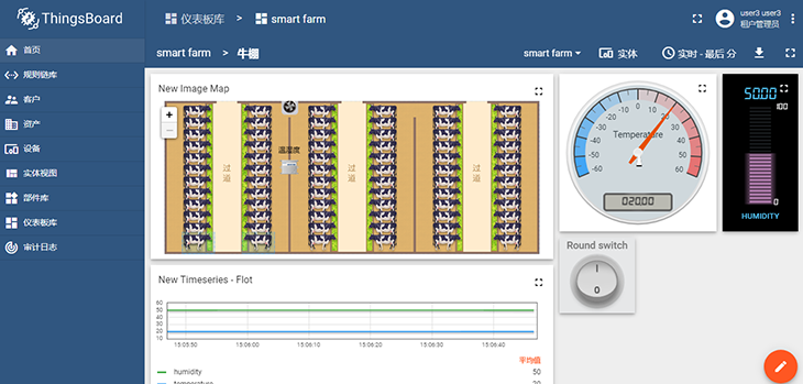 圖:智慧牧場課程案例,在牛棚內(nèi)安裝溫濕度傳感器和排風扇,在ThingsBoard云平臺上制定規(guī)則策略,當棚內(nèi)溫度過高時自動開啟排風扇對牛棚進行降溫,以保障奶牛養(yǎng)殖環(huán)境處在適宜的溫度下。