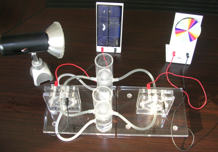 燃料電池教具是利用光線照射在太陽能電池板上產(chǎn)生電能,然后利用產(chǎn)生的電能作用在電解電池模塊上,使水發(fā)生電解產(chǎn)生氫氣和氧氣。氫氣和氧氣進入到發(fā)電模塊產(chǎn)生電能,帶動風扇轉(zhuǎn)動。