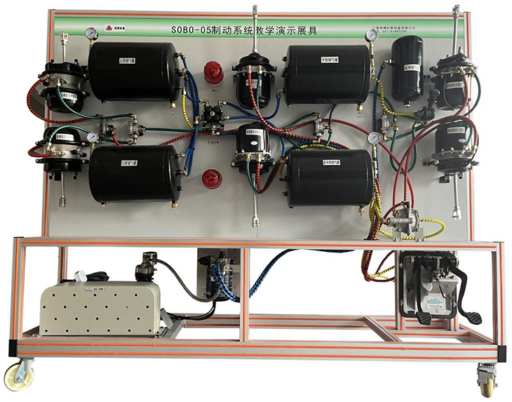 1.臺架上具有的 全新SX2220原車零部件有空氣壓縮機總成、空氣干燥劑、前橋儲氣筒、后橋儲氣筒、手制動儲氣筒、再生儲氣筒、輔助儲氣筒、四回路保護閥、制動腳閥、駐車閥、繼動閥、制動管路、氣壓表若干個。